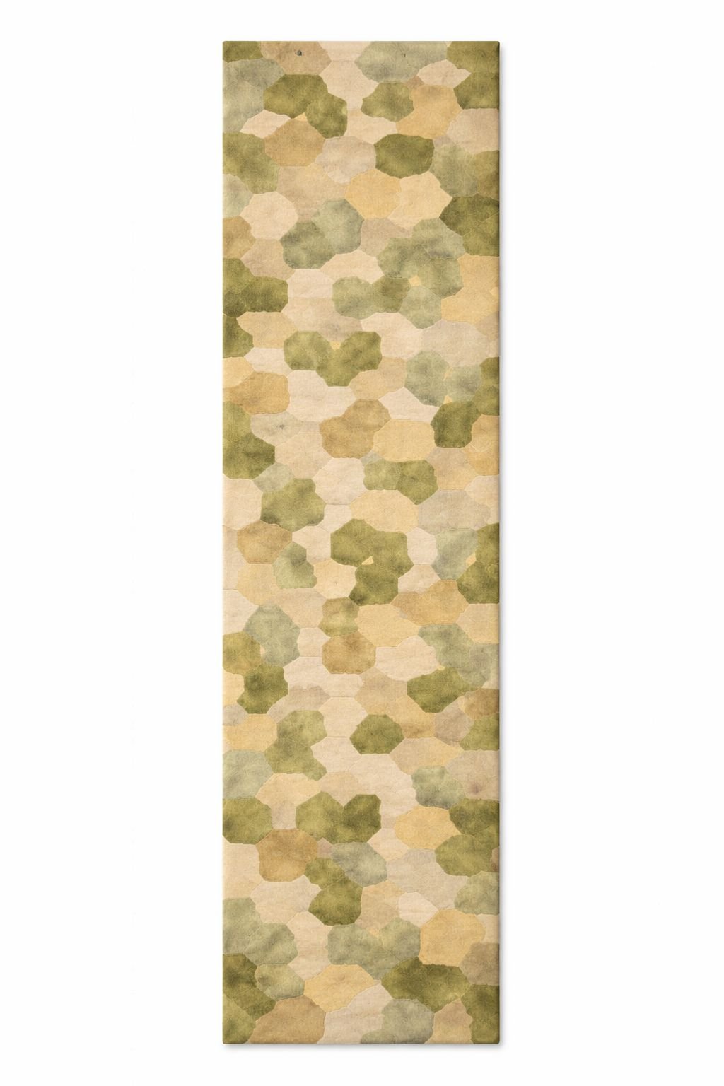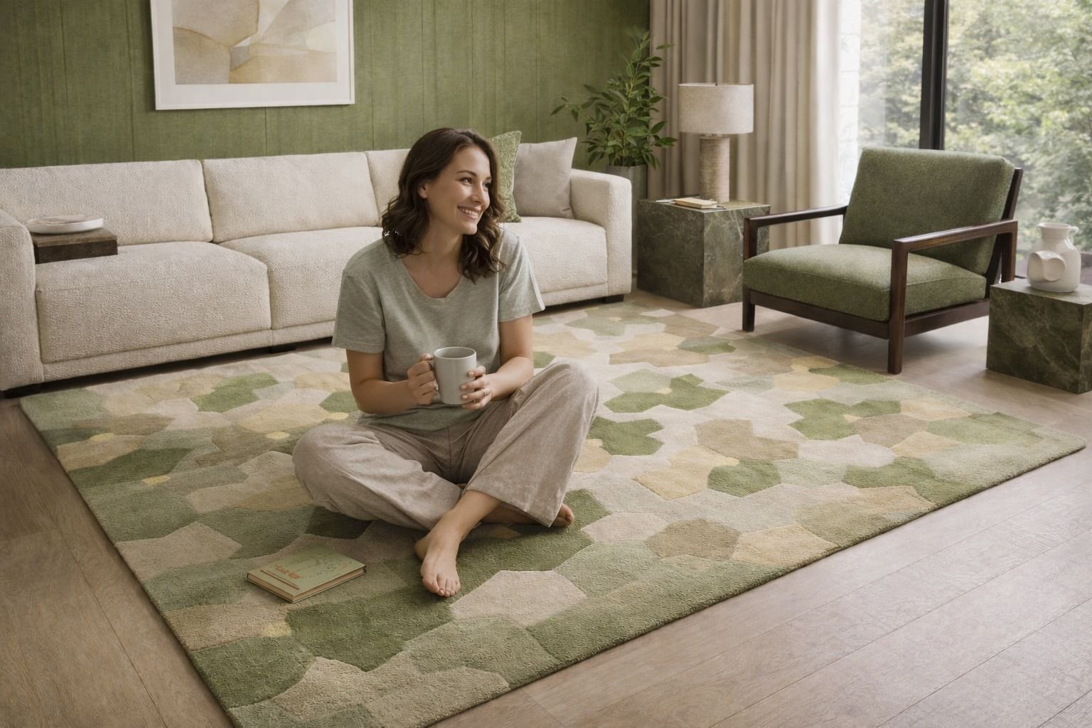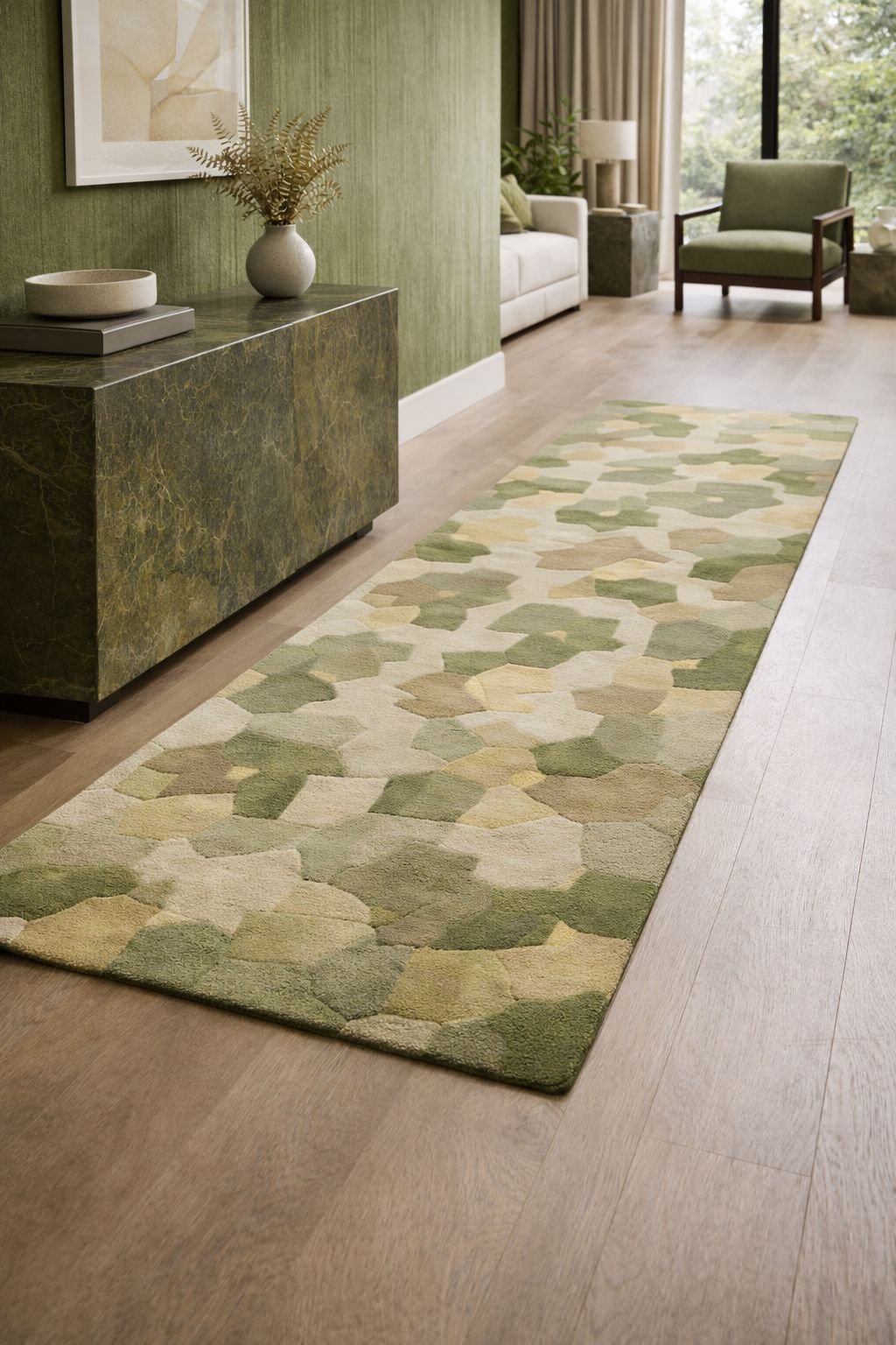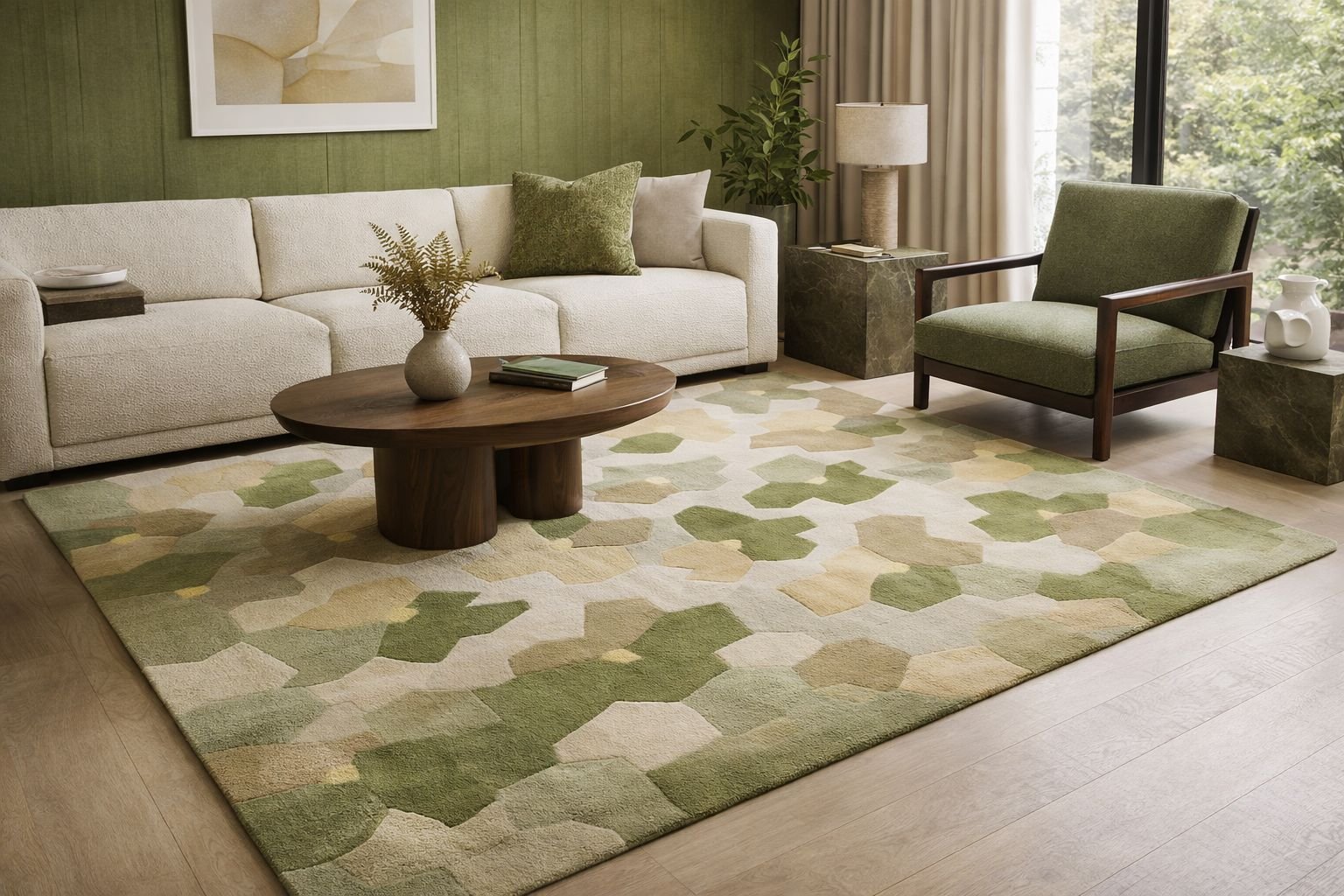 Bring warmth and modern elegance into your space with this abstract geometric area rug. Featuring a harmonious blend of earthy greens, soft beige, tan, and muted gold tones, this rug creates a calm and stylish foundation for any room.
