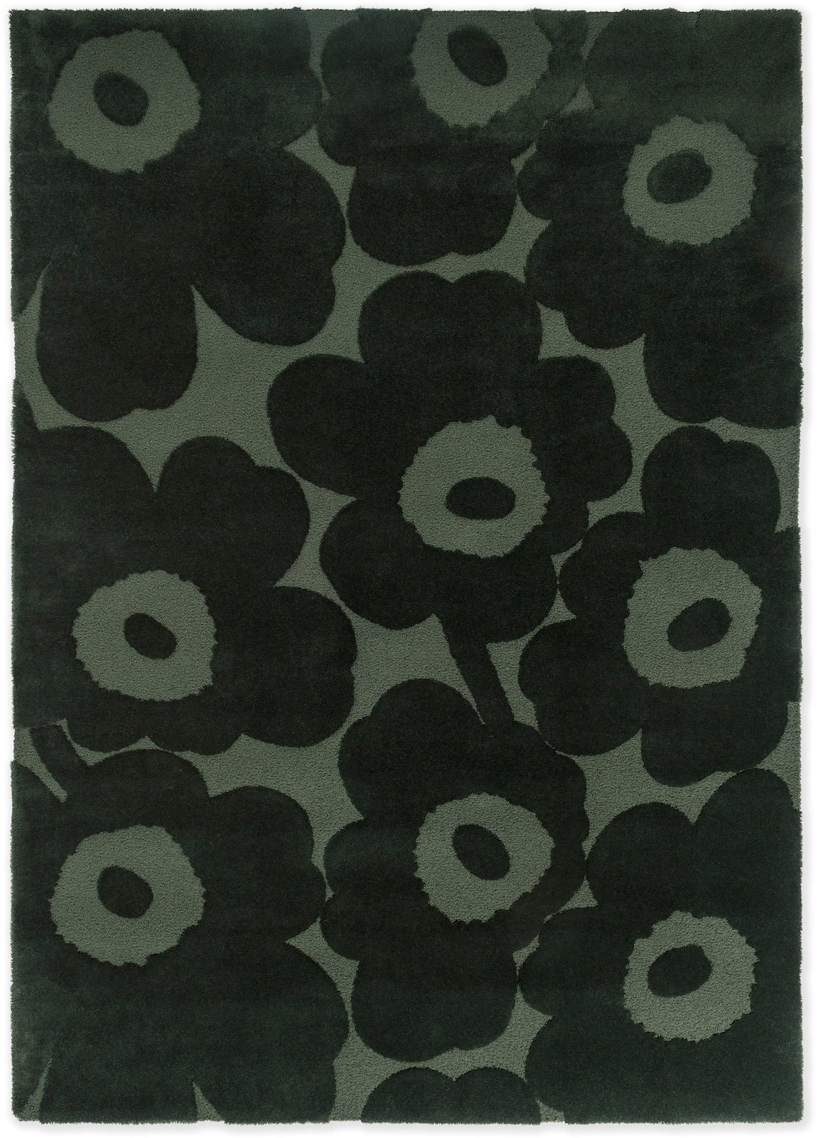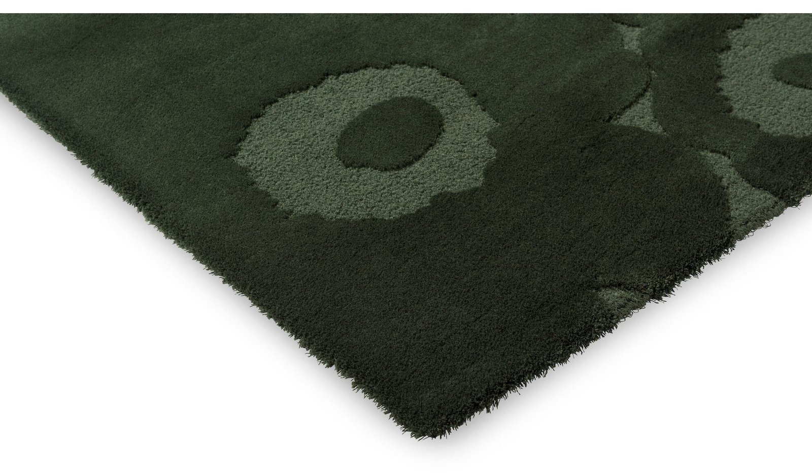 A sophisticated blend of deep forest green and muted olive tones, this rug plays with high and low pile textures to enhance the floral pattern, offering both visual depth and tactile richness. The rich green hues make it a versatile choice for minimalist, earthy, or monochrome interiors.